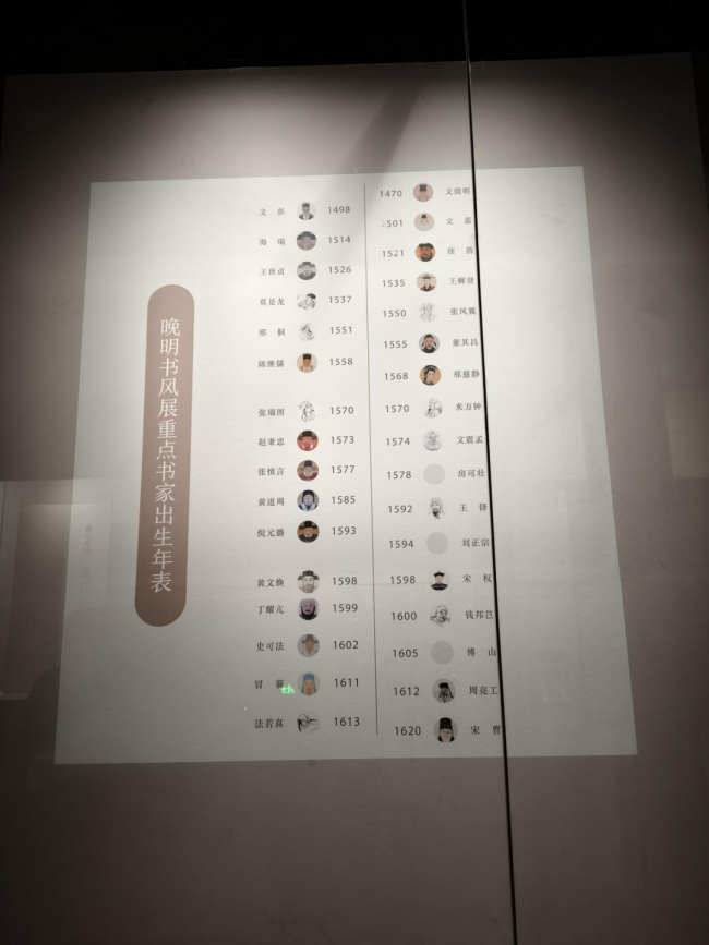 为了辅助观众更好地了解晚明书家和他们的作品风格✿◈ღ✿,策展团队设计了两个特别的展板✿◈ღ✿。一是“晚明书风代表书家出生年表”✿◈ღ✿,不同书法流派相竞相融✿◈ღ✿,两两比较下究竟是谁对谁产生了影响✿◈ღ✿,依据“时间表”✿◈ღ✿,这个问题的答案可谓一目了然✿◈ღ✿。二是“晚明书风发展的三条脉络”✿◈ღ✿,观众可结合这个版面✿◈ღ✿,在观展中一步步还原精彩纷呈的晚明书法史✿◈ღ✿,体验探索的乐趣✿◈ღ✿。